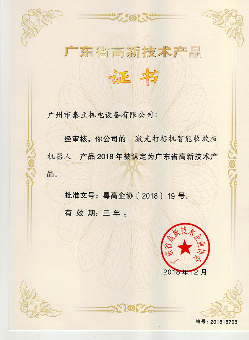 《激光打標(biāo)機(jī)智能放板機(jī)器人高新技術(shù)產(chǎn)品證書》