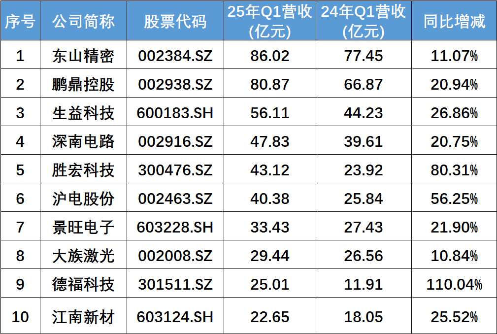 東山精密、鵬鼎控股等行業(yè)10強(qiáng)一季度營收達(dá)464.86億元,同比增長28.47%,占總營收的56.63%。